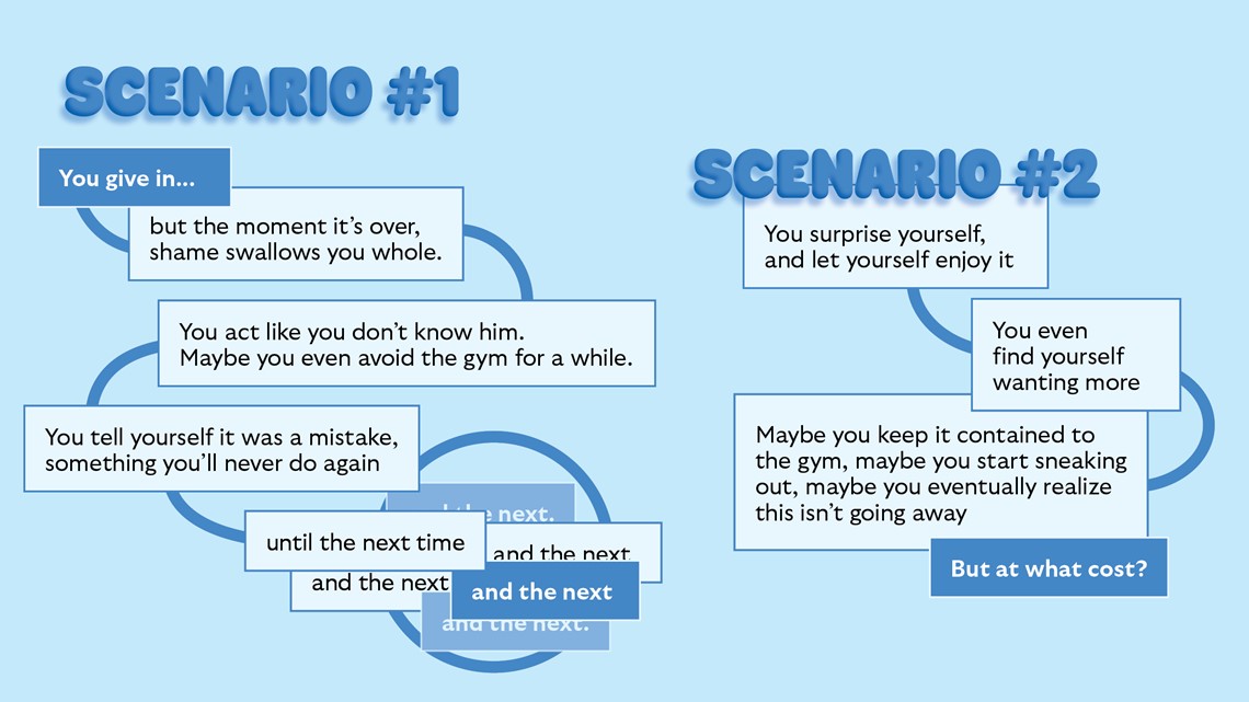 You swallow and look away, adjusting yourself, willing your body to behave. You tell yourself it’s nothing. Just a weird tension, a misunderstanding, a mistake.